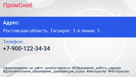 Для связи с организацией воспользуйтесь номером телефона: +7-900-122-34-34. Пн: c 09:00-18:00, Вт: c 09:00-18:00, Ср: c 09:00-18:00, Чт: c 09:00-18:00, Пт: c 09:00-18:00, Сб: выходной, Вс: выходной, вы можете обратиться в эту организацию.