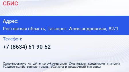 СБИС по адресу Ростовская область, Таганрог, Александровская, 82/1 в дальнейшем Организация, размещена в следующих категориях: