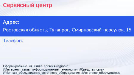 Сервисный центр по адресу Ростовская область, Таганрог, Смирновский переулок, 15 в дальнейшем Организация, размещена в следующих категориях: