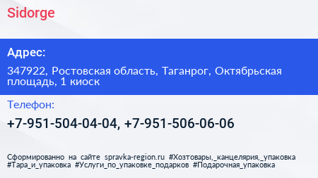 Sidorge по адресу 347922, Ростовская область, Таганрог, Октябрьская площадь, 1 киоск в дальнейшем Организация, размещена в следующих категориях: