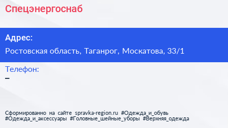 Спецэнергоснаб по адресу Ростовская область, Таганрог, Москатова, 33/1 в дальнейшем Организация, размещена в следующих категориях: