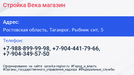 Стройка Века, магазин по адресу Ростовская область, Таганрог, Рыбник снт, 5 в дальнейшем Организация, размещена в следующих категориях: