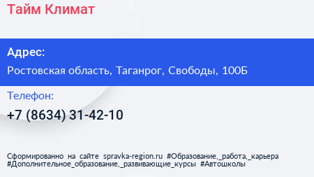 Тайм Климат по адресу Ростовская область, Таганрог, Свободы, 100Б в дальнейшем Организация, размещена в следующих категориях: