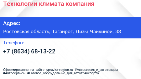 Технологии климата, компания по адресу Ростовская область, Таганрог, Лизы Чайкиной, 33 в дальнейшем Организация, размещена в следующих категориях: