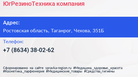 ЮгРезиноТехника, компания по адресу Ростовская область, Таганрог, Чехова, 351Б в дальнейшем Организация, размещена в следующих категориях: