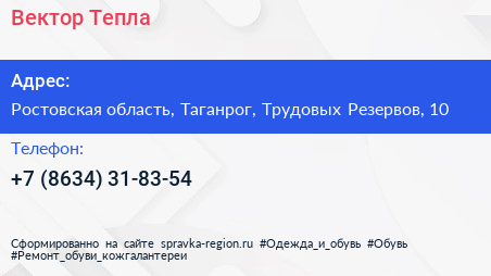 Вектор Тепла по адресу Ростовская область, Таганрог, Трудовых Резервов, 10 в дальнейшем Организация, размещена в следующих категориях: