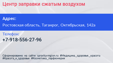 Центр заправки сжатым воздухом по адресу Ростовская область, Таганрог, Октябрьская, 142а в дальнейшем Организация, размещена в следующих категориях: