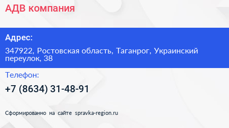 АДВ, компания по адресу 347922, Ростовская область, Таганрог, Украинский переулок, 38 в дальнейшем Организация, размещена в следующих категориях: