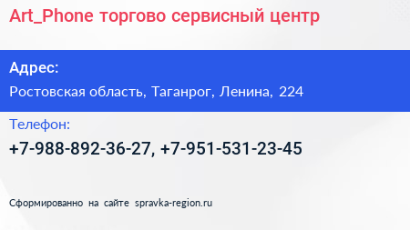 Art_Phone, торгово-сервисный центр по адресу Ростовская область, Таганрог, Ленина, 224 в дальнейшем Организация, размещена в следующих категориях: