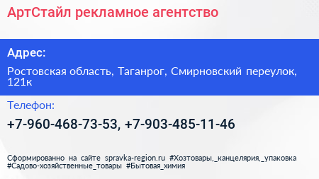 АртСтайл, рекламное агентство по адресу Ростовская область, Таганрог, Смирновский переулок, 121к в дальнейшем Организация, размещена в следующих категориях: