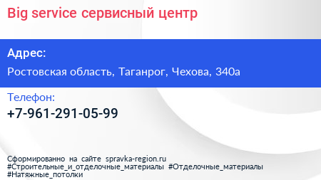 Big-service, сервисный центр по адресу Ростовская область, Таганрог, Чехова, 340а в дальнейшем Организация, размещена в следующих категориях: