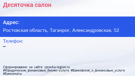 Десяточка, салон по адресу Ростовская область, Таганрог, Александровская, 52 в дальнейшем Организация, размещена в следующих категориях: