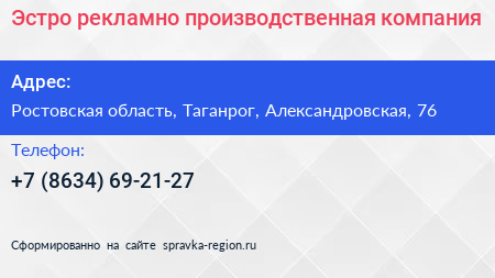 Эстро, рекламно-производственная компания по адресу Ростовская область, Таганрог, Александровская, 76 в дальнейшем Организация, размещена в следующих категориях: