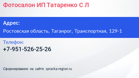 Фотосалон, ИП Татаренко С.Л. по адресу Ростовская область, Таганрог, Транспортная, 129-1 в дальнейшем Организация, размещена в следующих категориях: