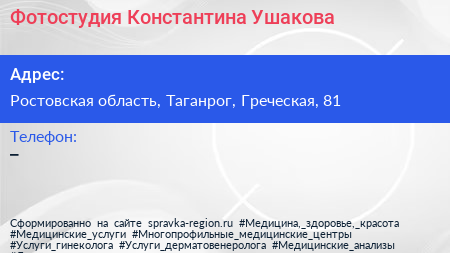 Фотостудия Константина Ушакова по адресу Ростовская область, Таганрог, Греческая, 81 в дальнейшем Организация, размещена в следующих категориях:
