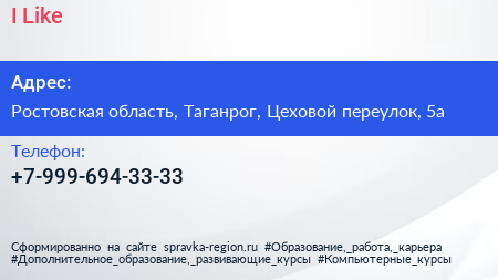 I-Like по адресу Ростовская область, Таганрог, Цеховой переулок, 5а в дальнейшем Организация, размещена в следующих категориях: