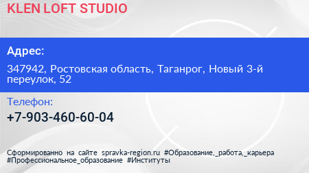 KLEN LOFT STUDIO по адресу 347942, Ростовская область, Таганрог, Новый 3-й переулок, 52 в дальнейшем Организация, размещена в следующих категориях: