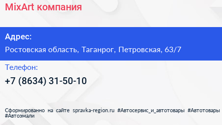 MixArt, компания по адресу Ростовская область, Таганрог, Петровская, 63/7 в дальнейшем Организация, размещена в следующих категориях:
