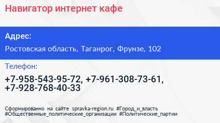 Навигатор, интернет-кафе по адресу Ростовская область, Таганрог, Фрунзе, 102 в дальнейшем Организация, размещена в следующих категориях: