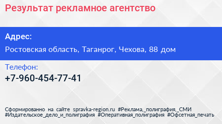 Результат, рекламное агентство по адресу Ростовская область, Таганрог, Чехова, 88 дом в дальнейшем Организация, размещена в следующих категориях: