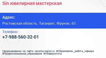 Sin, ювелирная мастерская по адресу Ростовская область, Таганрог, Фрунзе, 65 в дальнейшем Организация, размещена в следующих категориях: