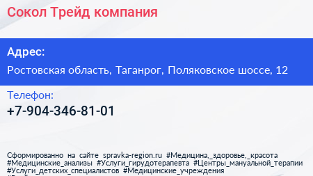Сокол Трейд, компания по адресу Ростовская область, Таганрог, Поляковское шоссе, 12 в дальнейшем Организация, размещена в следующих категориях: