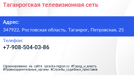 Таганрогская телевизионная сеть по адресу 347922, Ростовская область, Таганрог, Петровская, 25 в дальнейшем Организация, размещена в следующих категориях: