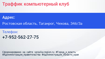 Траффик, компьютерный клуб по адресу Ростовская область, Таганрог, Чехова, 346/3а в дальнейшем Организация, размещена в следующих категориях: