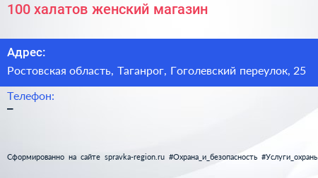 100 халатов, женский магазин по адресу Ростовская область, Таганрог, Гоголевский переулок, 25 в дальнейшем Организация, размещена в следующих категориях: