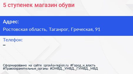 5 ступенек, магазин обуви по адресу Ростовская область, Таганрог, Греческая, 91 в дальнейшем Организация, размещена в следующих категориях: