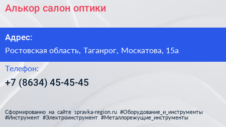 Алькор, салон оптики по адресу Ростовская область, Таганрог, Москатова, 15а в дальнейшем Организация, размещена в следующих категориях: