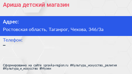 Ариша, детский магазин по адресу Ростовская область, Таганрог, Чехова, 346/3а в дальнейшем Организация, размещена в следующих категориях: