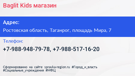 Baglit Kids, магазин по адресу Ростовская область, Таганрог, площадь Мира, 7 в дальнейшем Организация, размещена в следующих категориях: