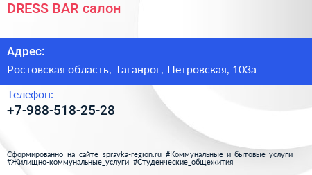 DRESS BAR, салон по адресу Ростовская область, Таганрог, Петровская, 103а в дальнейшем Организация, размещена в следующих категориях: