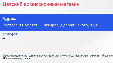 Детский комиссионный магазин по адресу Ростовская область, Таганрог, Дзержинского, 160 в дальнейшем Организация, размещена в следующих категориях: