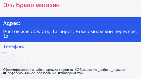 Эль Браво, магазин по адресу Ростовская область, Таганрог, Комсомольский переулок, 1а в дальнейшем Организация, размещена в следующих категориях: