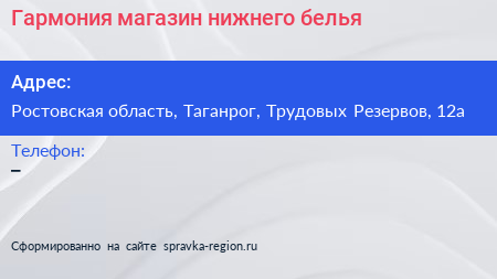 Гармония, магазин нижнего белья по адресу Ростовская область, Таганрог, Трудовых Резервов, 12а в дальнейшем Организация, размещена в следующих категориях: