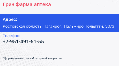 Грин Фарма, аптека по адресу Ростовская область, Таганрог, Пальмиро Тольятти, 30/3 в дальнейшем Организация, размещена в следующих категориях: