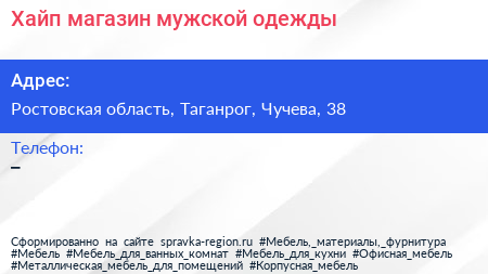 Хайп, магазин мужской одежды по адресу Ростовская область, Таганрог, Чучева, 38 в дальнейшем Организация, размещена в следующих категориях: