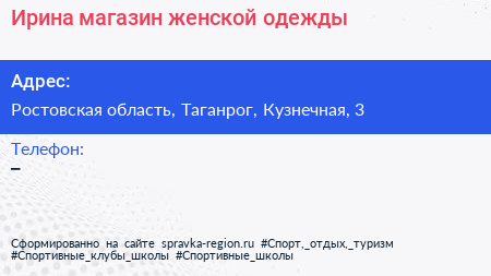 Ирина, магазин женской одежды по адресу Ростовская область, Таганрог, Кузнечная, 3 в дальнейшем Организация, размещена в следующих категориях: