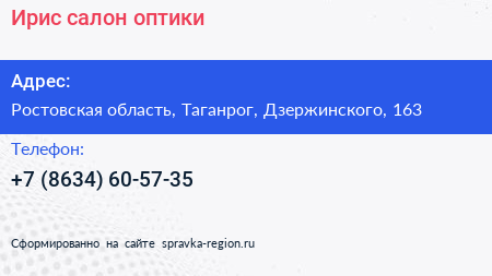 Ирис, салон оптики по адресу Ростовская область, Таганрог, Дзержинского, 163 в дальнейшем Организация, размещена в следующих категориях: