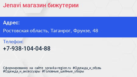 Jenavi, магазин бижутерии по адресу Ростовская область, Таганрог, Фрунзе, 48 в дальнейшем Организация, размещена в следующих категориях: