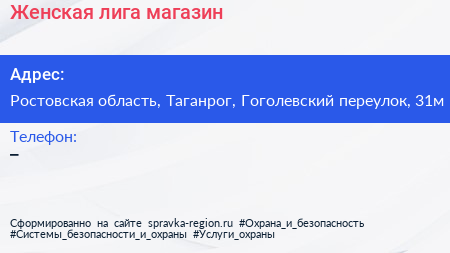 Женская лига, магазин по адресу Ростовская область, Таганрог, Гоголевский переулок, 31м в дальнейшем Организация, размещена в следующих категориях: