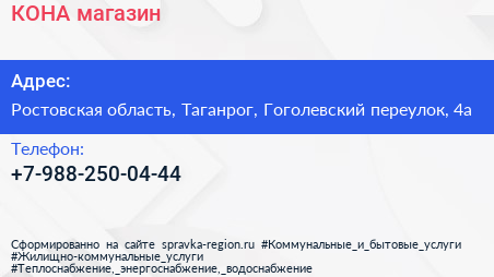 КОНА, магазин по адресу Ростовская область, Таганрог, Гоголевский переулок, 4а в дальнейшем Организация, размещена в следующих категориях: