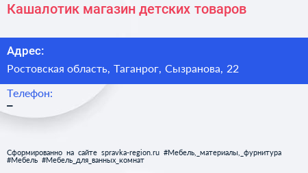 Кашалотик, магазин детских товаров по адресу Ростовская область, Таганрог, Сызранова, 22 в дальнейшем Организация, размещена в следующих категориях: