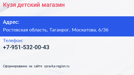 Кузя, детский магазин по адресу Ростовская область, Таганрог, Москатова, 6/36 в дальнейшем Организация, размещена в следующих категориях: