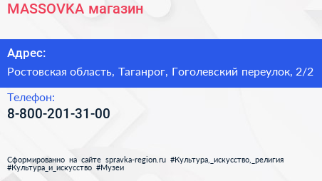 MASSOVKA, магазин по адресу Ростовская область, Таганрог, Гоголевский переулок, 2/2 в дальнейшем Организация, размещена в следующих категориях: