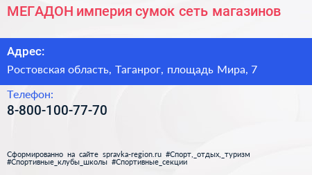 МЕГАДОН империя сумок, сеть магазинов по адресу Ростовская область, Таганрог, площадь Мира, 7 в дальнейшем Организация, размещена в следующих категориях: