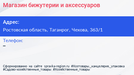 Магазин бижутерии и аксессуаров по адресу Ростовская область, Таганрог, Чехова, 363/1 в дальнейшем Организация, размещена в следующих категориях: