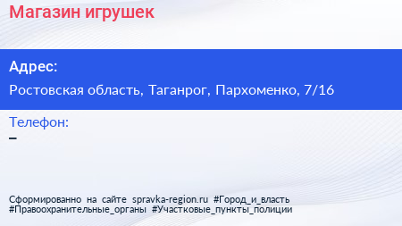 Магазин игрушек по адресу Ростовская область, Таганрог, Пархоменко, 7/16 в дальнейшем Организация, размещена в следующих категориях: